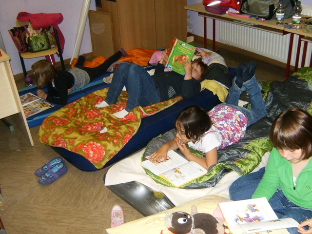 Gegen 17.30 Uhr verwandelten wir unsere Klassenzimmer in Schlafzimmer. Während Klasse 1 von Frau Holle an diesem Abend ins Märchenland entführt wurde, drehte sich in Klasse 3 alles rund um das Thema ''Pferd''. Sowohl Klasse 2 als auch Klasse 4 erlasen gemeinsam Kinderbücher. |