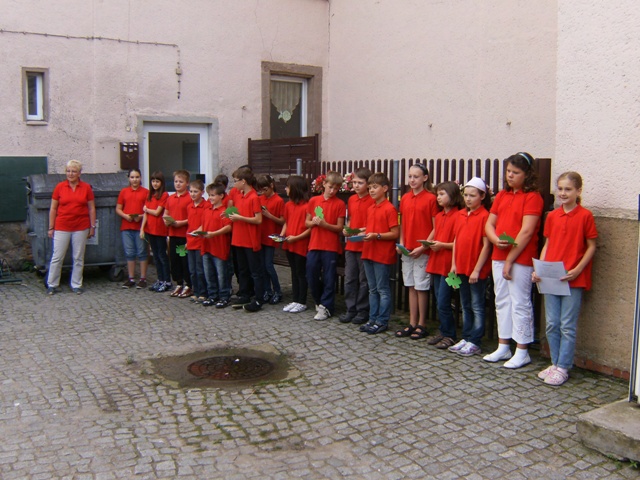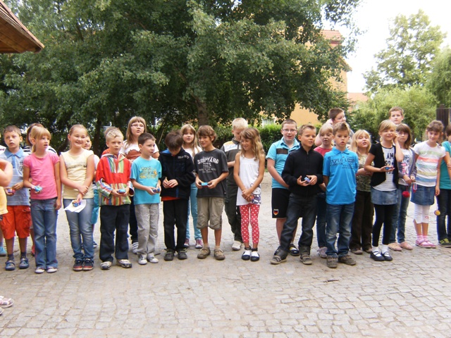 Natürlich durften auch die „Giftblätter“ an diesem Tag nicht fehlen. Nachdem sie in jeder Klasse ausgeteilt wurden, gab es ein vom Elternrat organisiertes Klassenfrühstück. Hier konnten sich die Kinder für einen ganz besonderen Programmpunkt stärken, denn danach durfte sich jedes Kind an der Klassenzimmerwand verewigen und somit ganz persönlich Abschied von der Schule nehmen. Ratzfatz waren die Klassenzimmer bunt wie nie. Handabdrücke, Namen, lustige, aber auch wehmütige Sprüche verzierten bald jede Wand. Wann hat man schon mal die Gelegenheit ganz unbehelligt an die Wand zu malen?! Danach ging es wieder raus auf den Schulhof. Unter Jubel wurden die Hüpfburg, das Trampolin und alle anderen lustigen Stationen von den Jungen und Mädchen in Beschlag genommen. Bald erklang auch noch die Feuerwehrsirene und brachte für alle ein leckere Portion Eis. Was für ein Tag! Mit einem lachenden und einem weinenden Auge verabschiedeten sich dann alle in die wohlverdienten Sommerferien. |