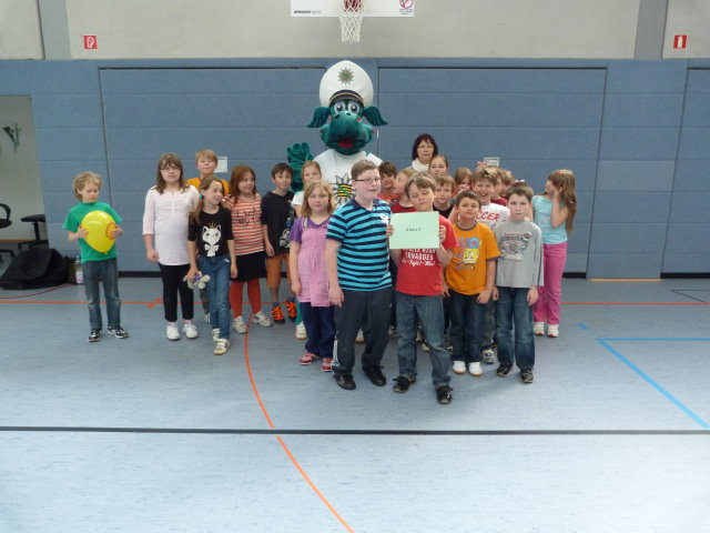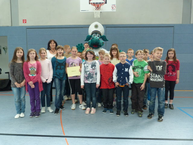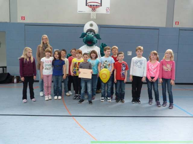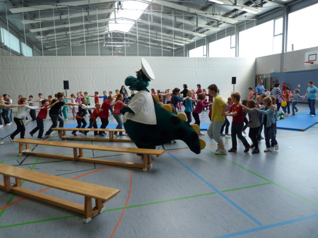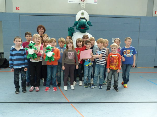 Am Dienstag, den 23.04.2013 war kein normaler Schultag. Poldi war in unserer Grundschule zu Besuch. Er ist ein 2,40 m großer Dinosaurier, der für Recht und Ordnung sorgt.