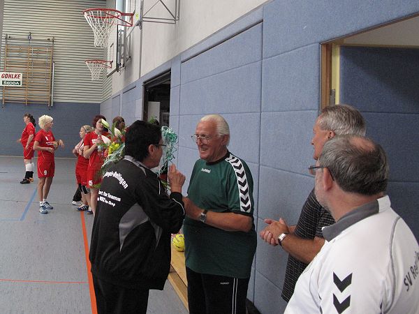 Handball - Zwei Pokale bleiben in Regis Am letzten Augustwochenende war es wieder so weit. Ein Jahr war vergangen und der 2. Walter-Jahn-Cup fand statt. Der Wettergott meinte es mit den Handballern nicht so gut. Den ganzen Vormittag Regen. Aber Organisatorin Simone Pilz hatte auch daran gedacht und sich das Zelt vom Feuerwehrverein aufbauen lassen. Einen Strauß Blumen mit Gedenkschleife brachte die Gärtnerei Rother auch in diesem Jahr zum Friedhof. 09:50 Uhr fanden sich der Bürgermeister der Stadt Regis-Breitingen Thomas Kratzsch, Herbert Jahn (fast 92), Jörg Krummsdorf und weitere Mitglieder des Handballvereins auf dem Hallenboden ein. Als erstes wurde Bernd Krebs aus den Reihen des Handballvereins verabschiedet. Danach ging es an die Eröffnung des 2. Cups. Herbert Jahn wurde mit Beifall der Mannschaften und der Zuschauer begrüßt. Nach dankenden Worten für die Unterstützung als Fan und Ratgeber und überreichten Blumen wurde Herbert Jahn zum Anwurfpunkt begleitet. Wie im vergangen Jahr gab es hier den obligatorischen Anwurf zur ersten Partie der Frauen aus Regis gegen TSV Wahren. Auch Thomas Kratzsch selbst früherer Handballer stand noch auf dem Parkett. Nachdem die Ehrengäste das Feld verlassen hatten, pfiff das Schiedsrichterpaar Dirk Otto und Marco Pilz die Partie ordnungsgemäß an. |
