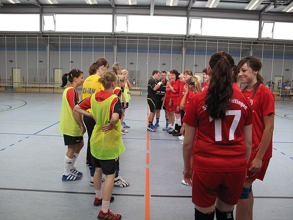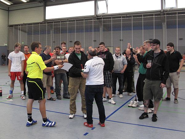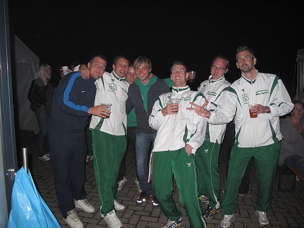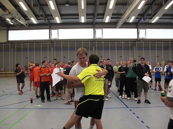 Nach der Siegerehrung ging man zum gemütlichen Teil über. Im Zelt hinter der Halle legte Steven Sprung Musik auf und bei Bier, Wein, Steak und Wurst hatten Alle noch viel Spaß. Als es dunkel wurde, stießen auch noch die Fußballer des SV Regis-Breitingen zu den Handballfreunden und feierten mit diesen die Siege vom Nachmittag auch im Fußball. Um 00:00 Uhr ließ man den Cup dann ruhig ausklingen und einige trafen sich am Morgen zum Saubermachen schon wieder in der Halle. |