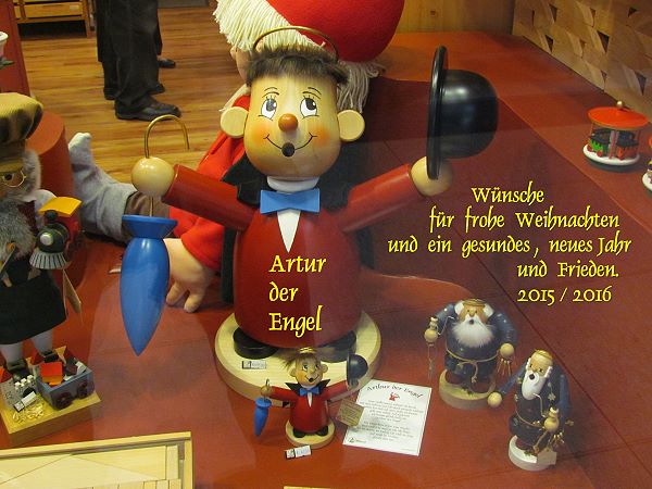 Artur der Engel kam einst im Trickfilm helfend vom Himmel und heutig gibt es ihn als Erzgebirgschen Räuchermann. |