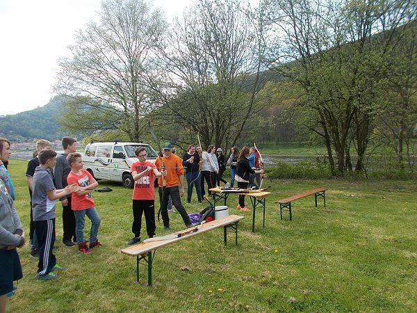 In den Monaten April und Mai nutzten die Schüler der 5.und 7. Klassen jeweils 3 Wandertage, um unser schönes Sachsen näher kennenzulernen. Die Klassen 5a/b führte ihre Fahrt nach Grethen in der Nähe von Grimma. Dort erlebten sie ereignisreiche Tage zum Thema „Teamfitness“. Die beiden 7. Klassen schulten ihre sportliche Beweglichkeit in Rathmannsdorf in der Sächsischen Schweiz. Für beide Klassenstufen stand Bogenschießen auf dem Plan. Während die Fünftklässler sich mehr der Teamarbeit, z.B. beim gemeinsamen Kochen von einer Kräuter- und Gemüsesuppe oder Backen von Fladenbrot, Lösen einer Teamaufgabe in der Natur und Geocatching, widmeten, mussten die Schüler der 7. Klasse bei einer Wasserwanderung auf der Elbe ihr Durchhaltevermögen und ihre Ausdauer unter Beweis stellen. Außerdem konnten beim Klettern alle Kinder ihre Stärke und Geschicklichkeit zeigen. Die Kleinen auf einer Niedrigseilbahn und Klettermöglichkeiten auf dem Gelände des Naturfreundehauses und die Großen in einer Kletterhalle nahe des Flusses oder beim Erkunden der Umgebung der Jugendherberge.